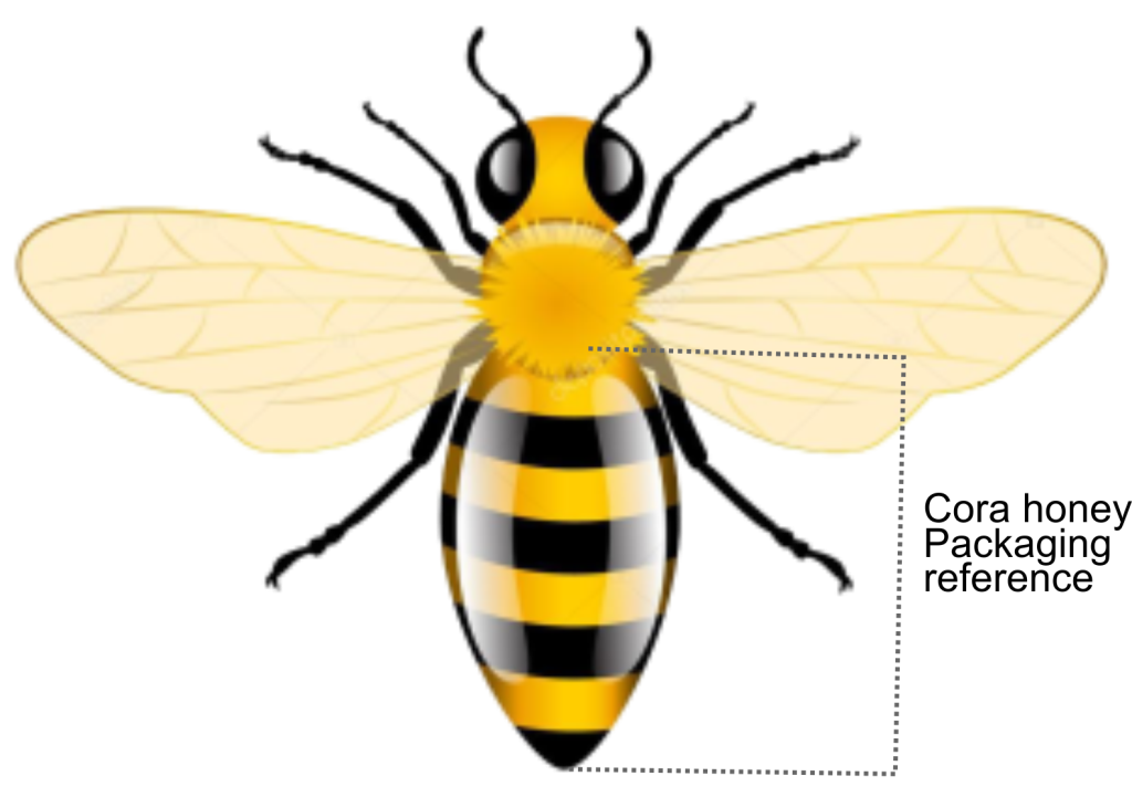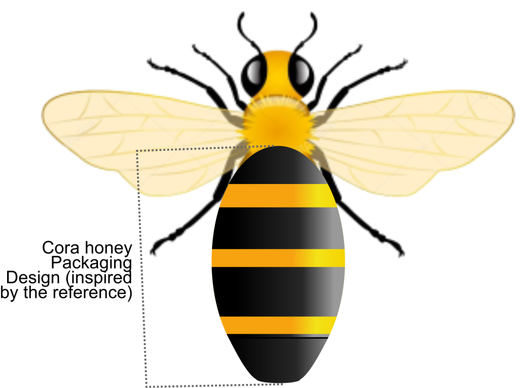 The Black Stripes on the bee's abdomen played a vital role in the design of the Cora Honey Packaging. The black stripes is used as a layer to convey and contrast vital marketing messages and the shape of the abdomen serves as a packaging form for the product content
